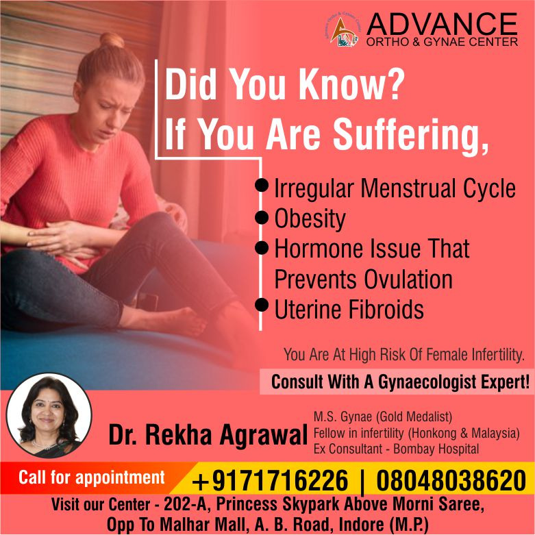 Best Gynaecologist For Female Infertility Treatment In Indore Female infertility is the inability to conceive a child after one year of unprotected intercourse. It can be caused by a variety of factors, such as Irregular menstrual cycle, Obesity, Hormone issues that prevent ovulation, Uterine fibroids, and Other medical conditions, such as endometriosis and polycystic ovary syndrome (PCOS). That’s the major reason for not getting pregnant. If you are experiencing any of these risk factors, it is important to see a gynecologist to get evaluated. Dr. Rekha Agrawal is the best gynecologist for female infertility treatment in Indore who provides the best treatment depending on the underlying cause. Visit Advance Ortho and Gynae Centre to consult with her!