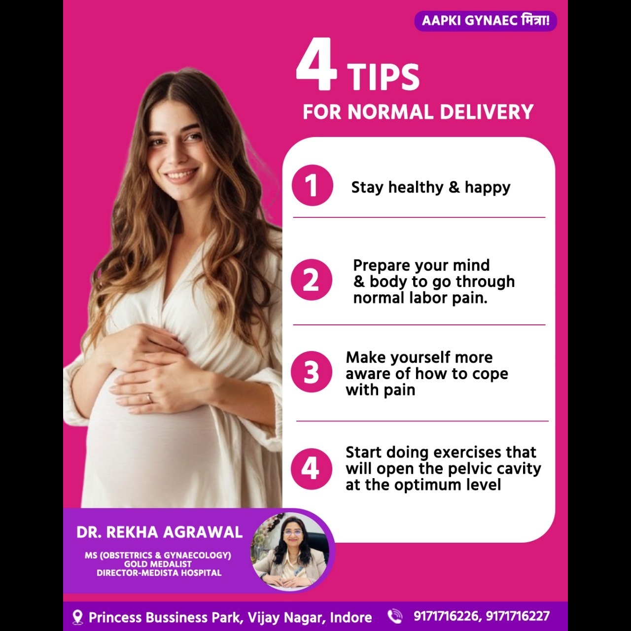 4 Tips for Normal Delivery! Stay Healthy & Happy 🌸 Every mother dreams of a smooth, safe, and natural childbirth experience. Pregnancy is not just a physical journey; it is an emotional transformation filled with hope, anticipation, and love. At Dr. Rekha Agrawal’s clinic, we understand that every pregnancy is unique, and every woman’s body responds differently to the process of childbirth. With the right guidance, care, and preparation, normal delivery can be a comfortable and positive experience. From the very beginning, maintaining good physical and emotional health plays a crucial role in determining how your body adapts to pregnancy and labor. Staying healthy and happy is the first step toward ensuring a normal delivery. A well-balanced diet rich in proteins, vitamins, and minerals keeps both mother and baby nourished, while emotional well-being supports hormonal balance and reduces stress. A calm, joyful mind helps the body prepare naturally for childbirth. Engaging in light physical activities, pursuing hobbies, and spending quality time with loved ones all contribute to a positive mindset and a stronger body. Preparing the mind and body for labor is equally important. Understanding the process of childbirth and the stages of labor helps reduce fear and anxiety. Gentle exercises, breathing techniques, and meditation build endurance and improve flexibility, allowing the body to handle labor more efficiently. At Dr. Rekha Agrawal’s clinic, mothers-to-be receive personalized prenatal guidance to strengthen both mental and physical readiness for a safe and natural delivery. The more informed and confident you are, the smoother your delivery experience becomes. Labor pain, though natural, can be managed effectively with the right mindset and techniques. Learning how to cope with pain through deep breathing, relaxation, and guided support makes a significant difference. When a woman understands what to expect, she can approach labor with courage rather than fear. Dr. Rekha Agrawal believes in empowering mothers through awareness, compassion, and consistent guidance, ensuring that they feel emotionally supported and physically prepared every step of the way. Regular exercise during pregnancy is another key to promoting a healthy normal delivery. Specific movements and prenatal yoga poses, done under expert supervision, help open the pelvic cavity and improve posture. These exercises encourage optimal baby positioning and enhance the body’s ability to manage contractions naturally. However, it’s always essential to consult your doctor before starting any new routine. At our clinic, each exercise plan is customized based on the mother’s health, comfort, and stage of pregnancy to ensure maximum safety and benefit. Beyond physical readiness, emotional reassurance and trust in your healthcare provider play a major role in how your delivery unfolds. The journey to motherhood is beautiful but can also be filled with uncertainties. Having an experienced and compassionate gynaecologist by your side makes all the difference. With years of expertise and a patient-first approach, Dr. Rekha Agrawal offers comprehensive care throughout pregnancy — from prenatal check-ups and nutrition guidance to safe delivery and postnatal recovery. At our clinic, every expecting mother is treated with warmth, understanding, and personalized attention. We believe that childbirth should be a celebration of life — a moment filled with strength, grace, and joy. Our approach combines medical excellence with emotional care to create a nurturing environment where both mother and baby feel secure. A normal delivery is not just about endurance; it’s about preparation, awareness, and positivity. With proper diet, regular check-ups, gentle exercise, and the right mindset, every woman can experience a healthy, natural birth. At Dr. Rekha Agrawal’s clinic, we are committed to walking beside you through every step of this remarkable journey, ensuring safety, comfort, and happiness. Stay healthy, stay happy, and embrace motherhood with confidence and care - because your health and your baby’s well-being are always our priority.