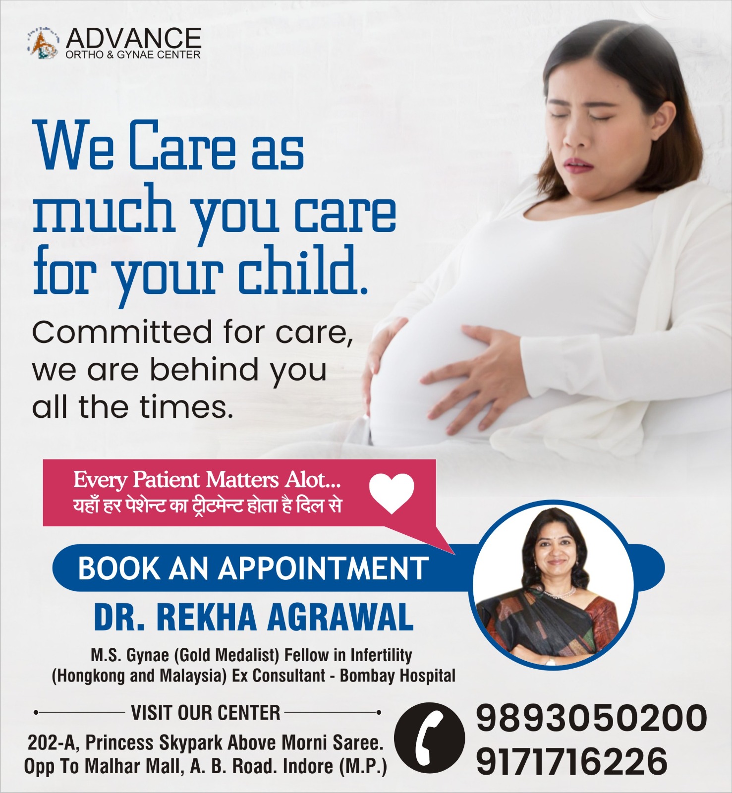 Best Lady Doctor For Pregnancy treatment in Indore We care as much as you care for your child. At Advance Ortho & Gynae Center, Dr. Rekha Agrawal provides the best pregnancy care in Indore, ensuring a safe and healthy journey for both mother and baby. With expert prenatal care, high-risk pregnancy management, and personalized support, we stand by you at every step. Committed to care, we are behind you all the time. Book your consultation today!