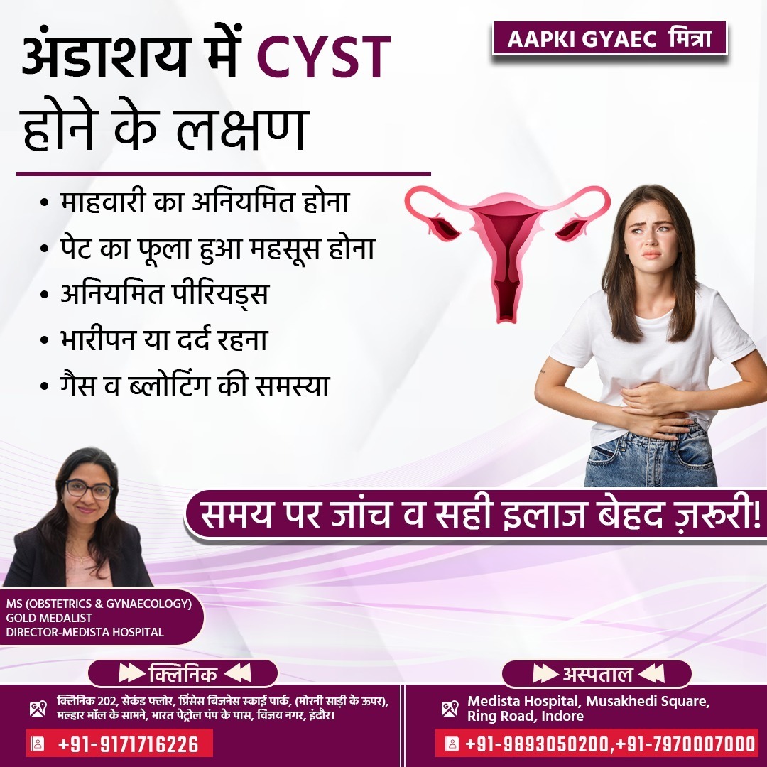 Best Ovarian Cancer Risk Assessment & Treatment in Vijay Nagar, Indore By Dr. Rekha Agrawal – Medista Hospital Ovarian Cancer Kya Hai? Ovarian cancer ek serious women’s health condition hai jo ovaries (अंडाशय) se shuru hoti hai -Early stage mein symptoms clear nahi hote, isliye aksar late diagnosis hota hai -Sahi time par risk assessment aur check-up se early detection possible hota hai -Ovarian Cancer Risk Assessment Kyon Zaroori Hai -Har woman ka risk level alag hota hai -Risk assessment sirf test nahi, complete evaluation hota hai -Isme medical history, family history aur lifestyle ko dhyan mein rakha jata hai High-risk factors include: Family history of ovarian, breast ya colorectal cancer Genetic mutation (BRCA1 / BRCA2) Endometriosis -Early periods ya late menopause -Obesity aur hormonal imbalance -Ovarian Cancer Ke Common Symptoms -Pet ka bar-bar phoola hua lagna (bloating) -Pelvic ya lower abdominal pain -Periods ka irregular hona -Pet mein heaviness ya discomfort -Baar-baar urine aana -Bina wajah weight loss ya weight gain Agar ye symptoms repeat ho rahe hain, to ignore na karein. Medista Hospital Mein Diagnosis & Risk Evaluation Detailed gynecological consultation Pelvic ultrasound aur imaging tests Blood tests (tumor markers, agar required ho) Personal risk profiling Clear explanation of reports (medical jargon ke bina) -Ovarian Cancer Treatment Approach -Har patient ke liye personalised treatment plan -Reports aur stage ke according decision -Conservative treatment (jab possible ho) -Surgical planning (jab necessary ho) -Treatment ke baad regular follow-ups Why Choose Dr. Rekha Agrawal – Best Gynecologist in Indore -Years of experience in women’s health care -Honest aur ethical medical advice -Patient ko poora time aur attention -Unnecessary surgery ya treatment se bachav -Trusted by women from Vijay Nagar aur nearby areas -Medista Hospital – Women-Centric Care -Safe aur hygienic environment -Modern diagnostic facilities -Compassionate nursing staff -Privacy aur comfort ka poora dhyan -Easily accessible location in Indore Early Detection Ka Fayda -Cancer ko early stage par pakadne ka chance -Treatment zyada effective hota hai -Recovery better hoti hai -Emotional stress kam hota hai -Kab Doctor Se Turant Milna Chahiye -Agar family history ho -Agar symptoms bar-bar ho rahe ho -Agar periods irregular ho gaye ho -Agar pelvic pain ya bloating ignore nahi ho rahi ho Book Your Appointment Today -Best Ovarian Cancer Risk Assessment & Treatment in Vijay Nagar, Indore -Consultation with Dr. Rekha Agrawal – Best Gynecologist at Medista Hospital Address: Medista Hospital, Musakhedi Square, Ring Road, Indore Clinic: 202, Princess Business Sky Park, Vijay Nagar, Indore Call Now: +91-9171716226, 91-9171716227