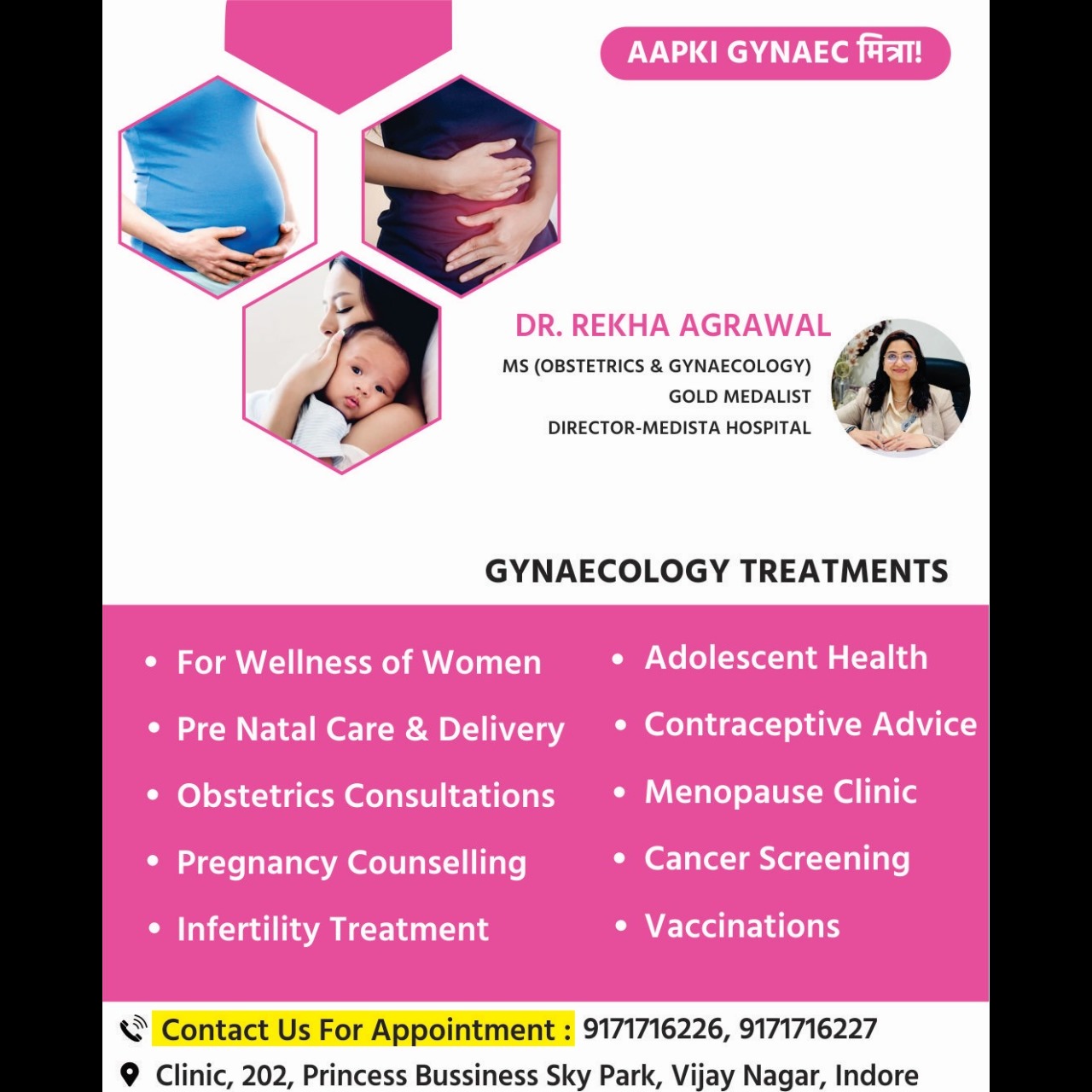 Welcome to Medista Women’s Clinic, where compassionate care meets medical excellence. Under the guidance of Dr. Rekha Agrawal (MS, Obstetrics & Gynaecology, Gold Medalist), we focus on complete wellness for women - from adolescence to motherhood and beyond. Dr. Rekha believes that women’s health isn’t just about treatment, it’s about trust and understanding. Her calm, caring approach and deep medical expertise make her one of the most trusted gynaecologists and obstetricians in Indore. - Comprehensive Care for Every Stage of Womanhood Every woman deserves care that adapts to her unique needs. At Medista Hospital, Dr. Rekha provides complete care at every stage of life - from a young girl’s first health consultation to pregnancy, menopause, and senior wellness. Our services include: Pre-Natal and Delivery Care: Safe, guided care through every stage of pregnancy, focusing on natural and stress-free deliveries. Obstetrics Consultation: Regular check-ups and detailed monitoring to ensure mother and baby’s well-being. Infertility Treatment: Advanced evaluation and treatment plans that bring hope and results. Menstrual and Hormonal Health: Solutions for PCOD, PCOS, irregular periods, and other hormonal concerns. Menopause Management: Helping women manage physical and emotional changes comfortably. Cancer Screening: Regular screening for cervical and breast cancer to ensure early detection and prevention. Adolescent and Teen Health: Guidance for young girls dealing with puberty, menstrual issues, or hormonal imbalances. At Gynaecologist & Obstetrician Clinic, every patient is treated with warmth, patience, and complete privacy - ensuring comfort at every visit. - Pregnancy & Motherhood Care Pregnancy is a life-changing journey, and Dr. Rekha Agrawal makes sure it’s a safe and beautiful one. With years of experience in normal delivery and high-risk pregnancy management, she has helped hundreds of women experience smooth, confident motherhood. From your first pregnancy test to your baby’s first cry, Dr. Rekha walks beside you every step of the way. Each consultation is designed to guide you clearly — explaining every process, test, and precaution with care and positivity. Our pregnancy services include: -Pre-pregnancy counseling -Antenatal (pre-natal) check-ups -Diet and lifestyle planning -Delivery and postnatal support -Lactation and postpartum care Dr. Rekha’s patients love her gentle approach and honest communication - making them feel supported, not rushed. “She treats every patient like family and always explains things in a way that makes you feel calm and confident.” Why Women Choose Dr. Rekha Agrawal Women across Indore trust Dr. Rekha Agrawal because she blends science with compassion. She doesn’t just treat symptoms - she focuses on the person behind them. Decades of experience in gynecology and obstetrics Specialization in normal deliveries and fertility care Advanced facilities and diagnostic equipment Patient-centered consultations and complete privacy Gentle, approachable, and understanding communication Her philosophy is simple - healthcare that listens, heals, and empowers. At Medista, every woman finds not just a doctor, but a guide who helps her make confident health choices. Book Your Appointment Today If you’re looking for the best gynaecologist in Indore, pregnancy doctor near me, or a trusted women’s health specialist, your search ends with Dr. Rekha Agrawal at Medista Women’s Clinic. Whether it’s routine check-ups, pregnancy support, or long-term wellness - we’re here to make sure you feel cared for, every step of the way.