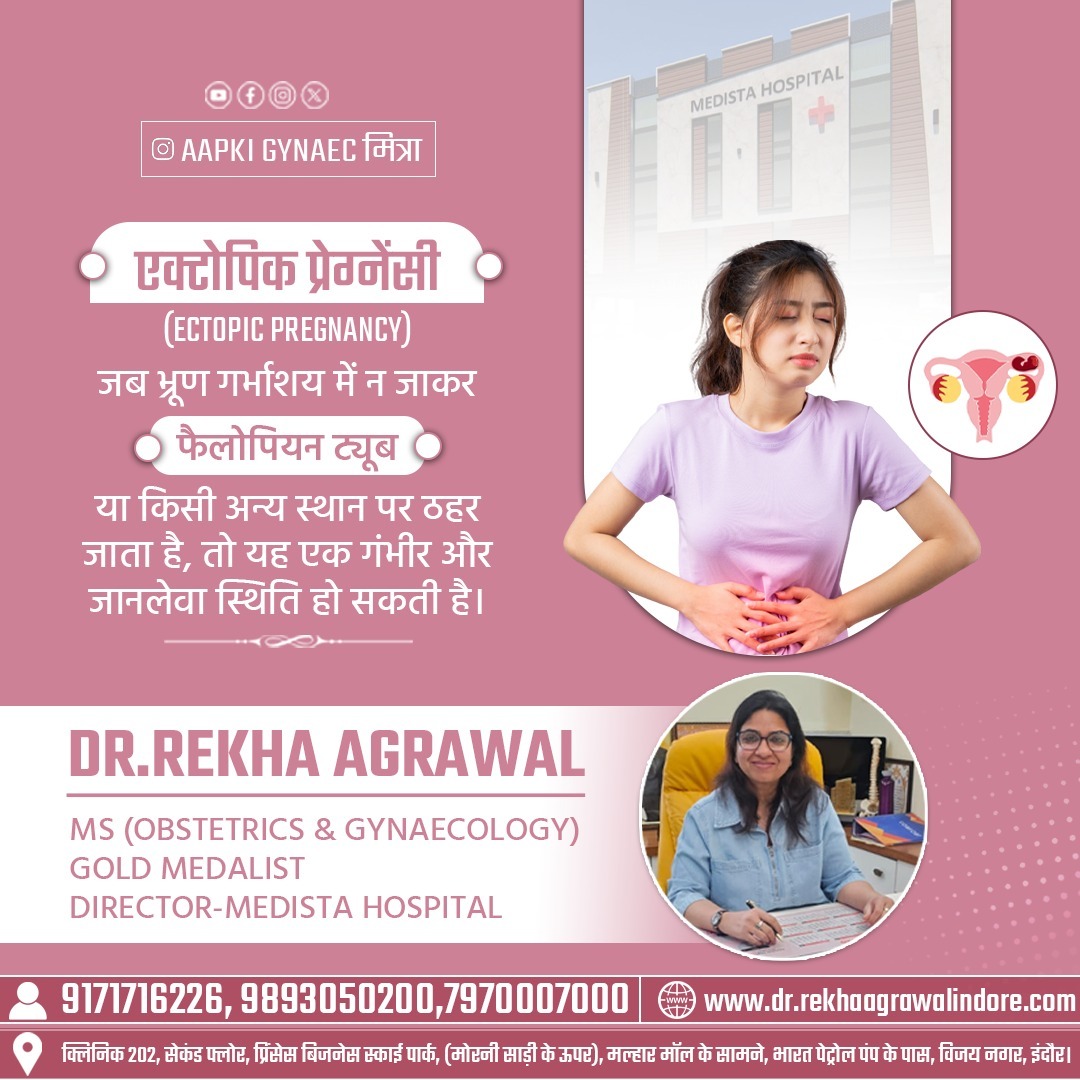 Ectopic Pregnancy Treatment in Vijay Nagar, Indore Expert Care by Dr. Rekha Agrawal – Obstetrician & Gynecologist Ectopic pregnancy ek serious medical condition hoti hai jisme pregnancy uterus (garbhashay) ke andar develop hone ke bajay fallopian tube, cervix ya kisi aur jagah par develop ho jaati hai. Normal pregnancy ke liye embryo ka uterus ke andar grow hona zaroori hota hai, lekin ectopic pregnancy mein yeh possible nahi hota. Agar time par diagnosis aur treatment na mile, to yeh mother ke liye life-threatening bhi ho sakti hai. Dr. Rekha Agrawal, MS (Obstetrics & Gynecology), Gold Medalist, ke under Vijay Nagar, Indore mein ectopic pregnancy ka safe, timely aur advanced treatment available hai. Dr. Rekha Agrawal ko high-risk pregnancy aur emergency gynecological cases handle karne ka kaafi experience hai. What is Ectopic Pregnancy? Ectopic pregnancy tab hoti hai jab fertilized egg uterus tak pahunchne ke bajay fallopian tube mein hi implant ho jaata hai. Kyunki fallopian tube pregnancy ko support nahi kar sakti, isliye jaise-jaise pregnancy grow karti hai, tube rupture hone ka risk badh jaata hai. Isi wajah se early diagnosis bahut zaroori hota hai. Common Symptoms of Ectopic Pregnancy Har woman mein symptoms alag ho sakte hain, lekin commonly yeh signs dekhe jaate hain: Lower abdomen ya pelvic area mein sharp pain Asamanya vaginal bleeding Chakkar aana ya behoshi jaisa feel hona Thakaan aur weakness Nausea ya vomiting Shoulder pain (internal bleeding ka sign) Agar pregnancy test positive ho aur upar diye gaye symptoms ho rahe hain, to turant gynecologist se consult karna chahiye. Diagnosis of Ectopic Pregnancy Medista Hospital, Vijay Nagar, Indore mein ectopic pregnancy ka diagnosis advanced medical facilities ke through kiya jaata hai, jaise: Blood tests (hCG levels check karna) Transvaginal ultrasound Clinical examination Accurate diagnosis se yeh decide kiya jaata hai ki pregnancy kitni advanced stage par hai aur kaunsa treatment best rahega. Ectopic Pregnancy Treatment Options Treatment patient ki condition par depend karta hai. Dr. Rekha Agrawal patient ki safety aur future fertility dono ko priority deti hain. Medical management – Early stage mein medicines ke through pregnancy ko safely treat kiya ja sakta hai Surgical treatment – Agar tube rupture ka risk ho ya internal bleeding ho, to surgery required hoti hai Har case mein personalized treatment plan banaya jaata hai.? -Why Choose Dr. Rekha Agrawal in Vijay Nagar, Indore? -Experienced Obstetrician & Gynecologist -Gold Medalist with strong clinical background -High-risk pregnancy handling expertise -Patient-friendly and compassionate approach -Accurate diagnosis & ethical treatment -Emergency care availability Dr. Rekha Agrawal ka focus sirf treatment par nahi, balki patient ko emotionally aur medically support karna bhi hota hai. When to Consult a Doctor? Agar aap pregnancy plan kar rahi hain ya pregnancy confirm ho chuki hai aur pain ya bleeding jaisi problem ho rahi hai, to delay bilkul na karein. Early consultation se serious complications ko avoid kiya ja sakta hai. Book Appointment – Vijay Nagar, Indore Agar aap Ectopic Pregnancy Treatment in Vijay Nagar, Indore ke liye trusted gynecologist dhoondh rahi hain, to Dr. Rekha Agrawal se aaj hi consult karein. Timely diagnosis aur right treatment aapki life aur future fertility dono ko safe rakh sakta hai. 📍 Location: Vijay Nagar, Indore 📞 Appointment ke liye call karein