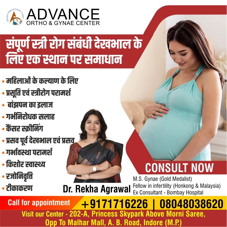 इंदौर की प्रशिद्ध स्त्री रोग विशेष्ज्ञ संपूर्ण स्त्री रोग संबंधी देखभाल के लिए एडवांस ऑर्थो एंड गयने सेंटर पर समाधान। डॉ. रेखा अग्रवाल महिलाओं के स्वास्थ्य के लिए, स्त्री रोग संबंधी देखभाल प्रदान करती है। यह सुनिश्चित करने में मदद करती है कि महिलाएं स्वस्थ, प्रजनन योग्य और खुश रहें। डॉ. रेखा अग्रवाल स्त्री रोग विशेषज्ञ हैं जो महिलाओं के लिए एक स्थान पर पूर्ण स्त्री रोग संबंधी देखभाल प्रदान करती हैं। वह आपकी सभी स्त्री रोग संबंधी आवश्यकताओं को पूरा करने के लिए प्रतिबद्ध हैं, जिसमें शामिल हैं प्रसूति एवं स्त्रीरोग परामर्श, बांझपन का इलाज, गर्भनिरोधक सलाह, कैंसर स्क्रीनिंग, प्रसव पूर्व देखभाल एवं प्रसव, गर्भावस्था परामर्श, किशोर स्वास्थ्य, व रजोनिवृत्ति टीकाकरण। तो आज ही हमारे साथ अपॉइंटमेंट बुक करें और डॉ. रेखा अग्रवाल से मिले और देखें कि वह कैसे आपकी मदद कर सकती हैं।