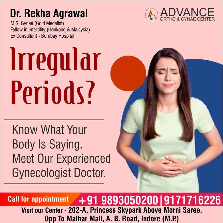 Regain control over your menstrual health with expert irregular periods treatment by Dr. Rekha Agrawal at Advance Ortho & Gynae Center a best gynecologist in Indore. Specializing in diagnosing and treating menstrual disorders, Dr. Rekha Agrawal addresses underlying causes such as hormonal imbalances, PCOD, or lifestyle factors with personalized care. Her holistic approach includes advanced diagnostic tools, medication, and lifestyle guidance to regulate cycles and improve reproductive health. With years of experience and a compassionate approach, Dr. Rekha Agrawal ensures effective and lasting solutions for your well-being.